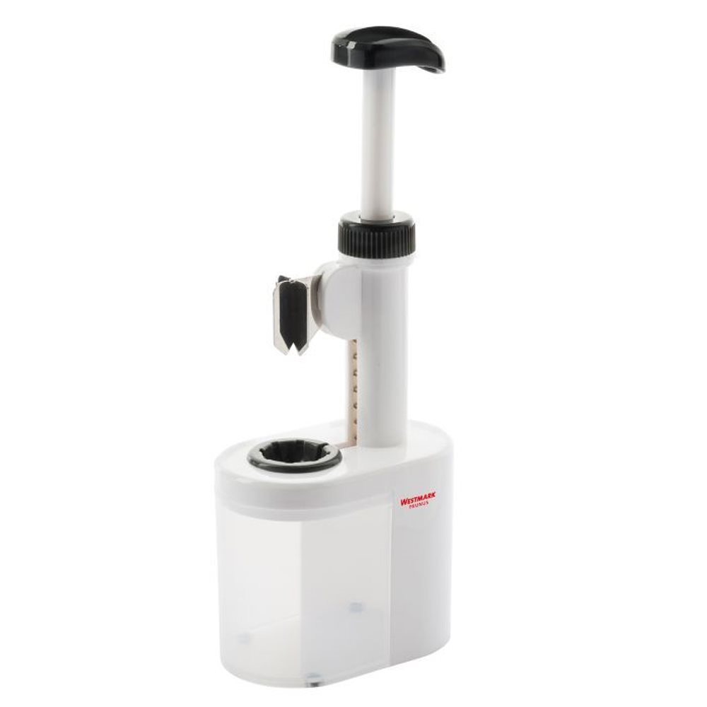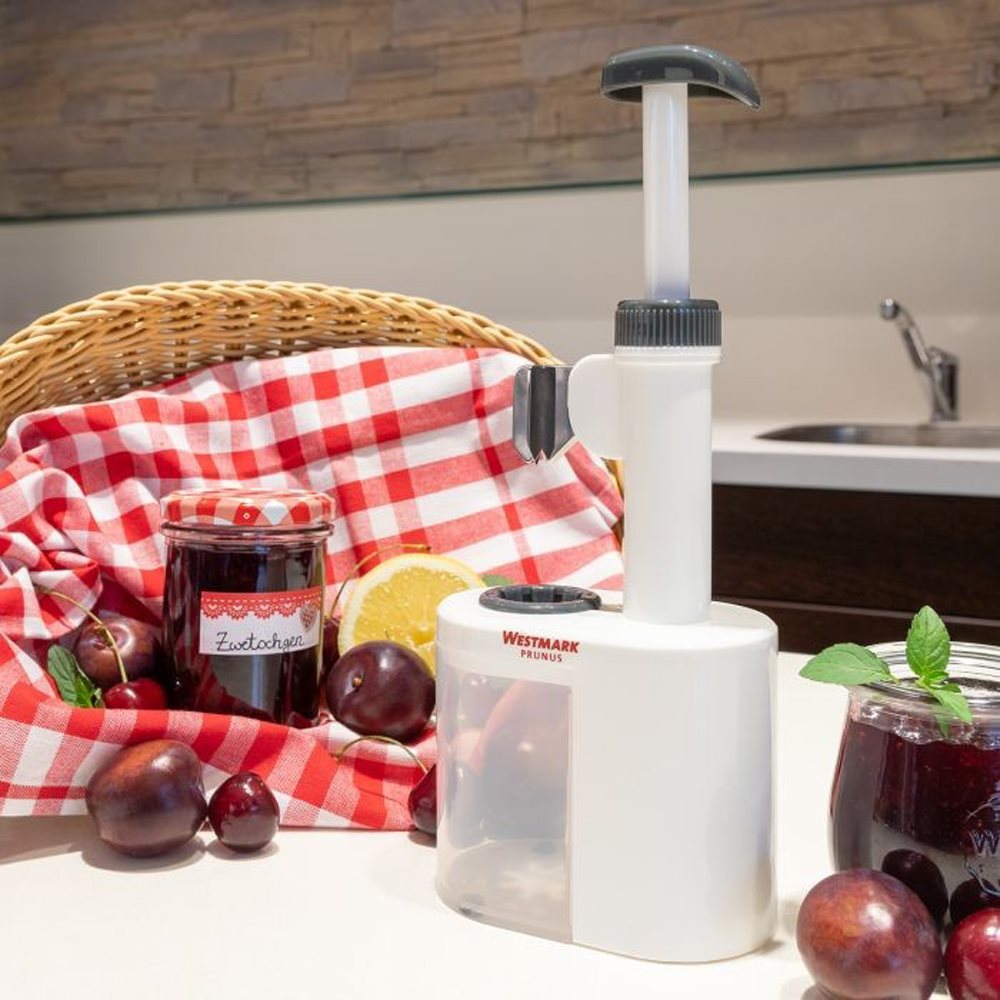 Dispozitiv compact pentru scos samburi de prune, marca Westmark, dimensiuni 24 x 11 x 6,5 cm, cu corp din polipropilena si lama din inox.