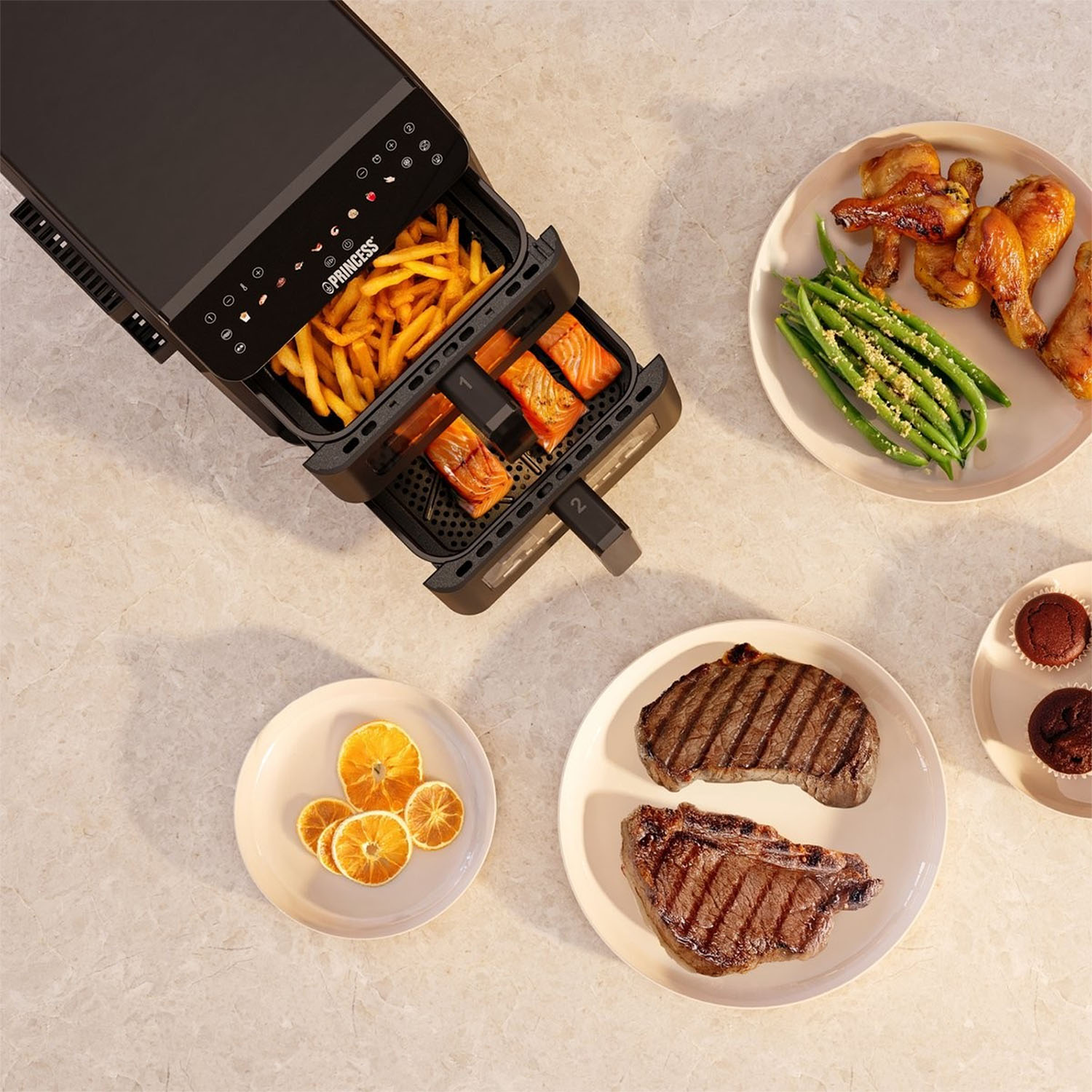 Friteuza verticala Princess dispune de doua cosuri cu capacitatea de 5,6 l. Prin folosirea lor simultana, puteti prepara cu usurinta o masa completa, fara a amesteca aromele. Este perfecta atat pentru familii mai numeroase, cat si pentru mese alaturi de preteni. Datorita functiei de sincronizare a celor cosuri, ambele preparate vor fi gata simultan - fie ca preparati cartofi prajiti, gustari, pui, peste, legume, fructe de mare sau pizza. Toate acestea, fara a trebui sa asteptati timpi suplimentari.