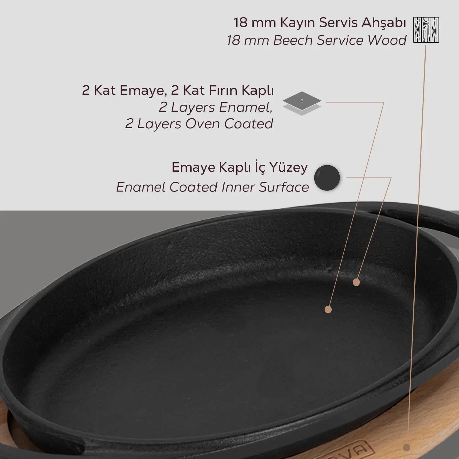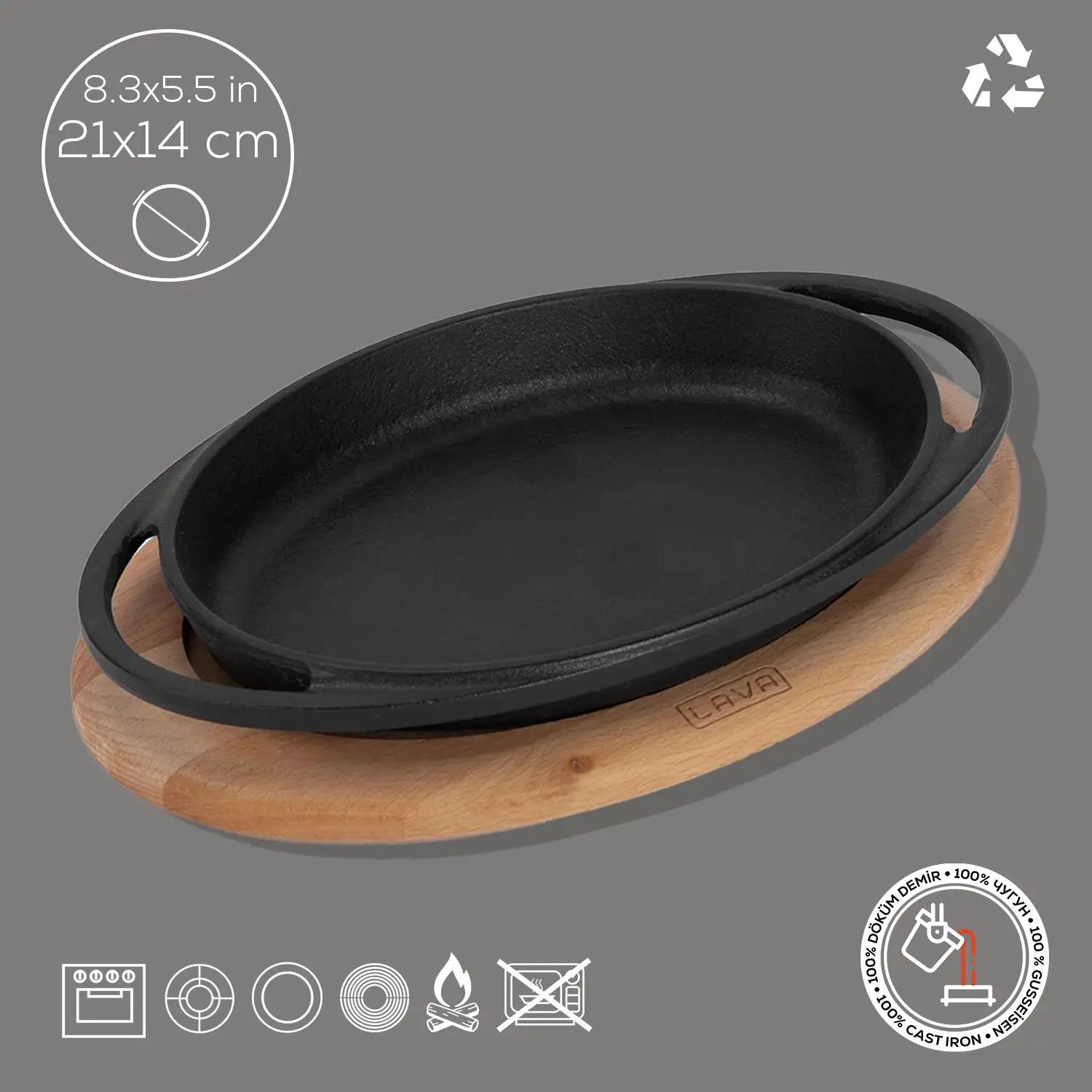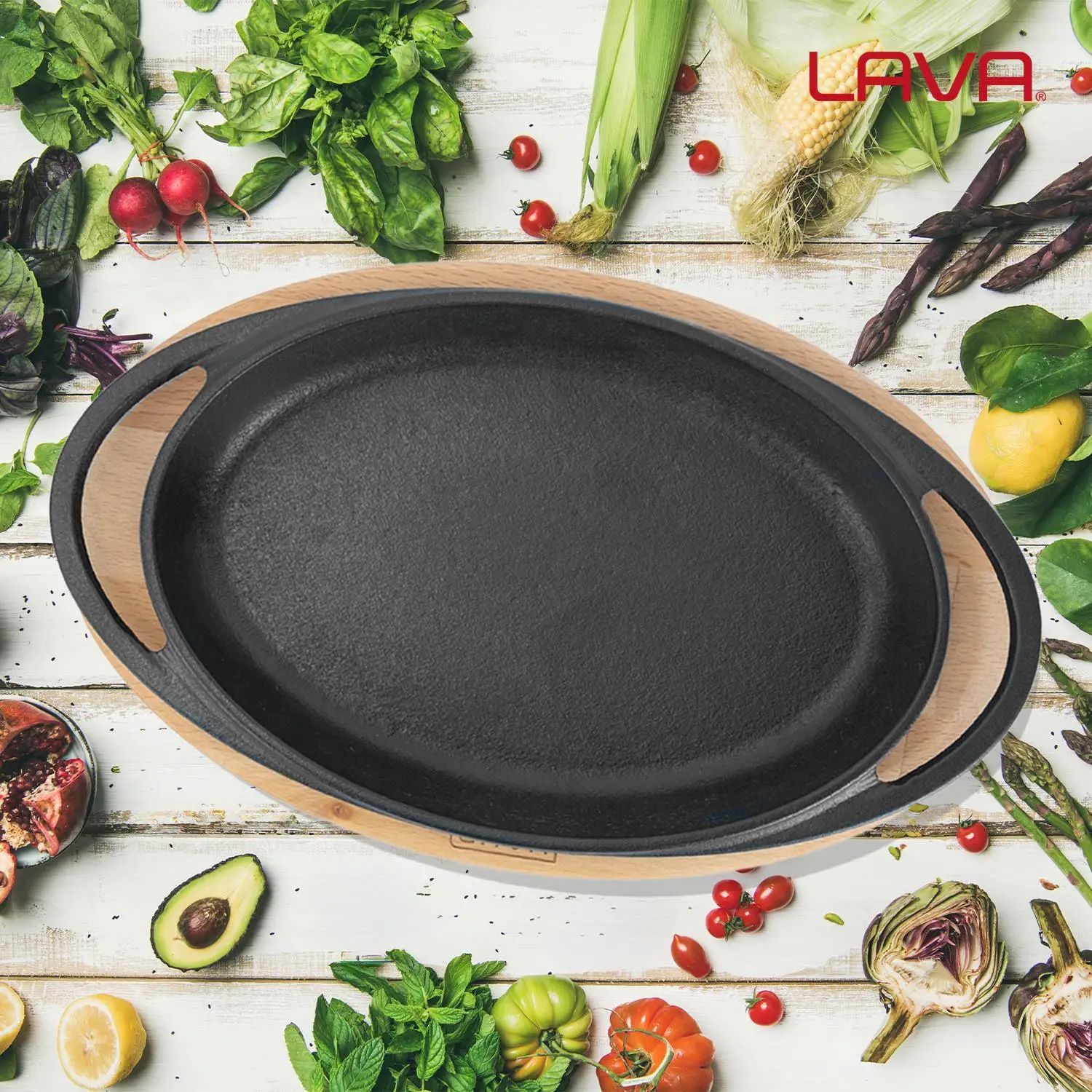 Tava ovala, marca Lava, fabricata din fonta, cu suport din lemn.
