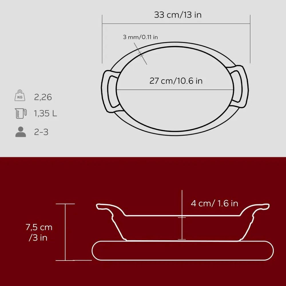 Tava ovala, cu suport din lemn de fag, marca Lava, dimensiune tava (fara manere) 27 x 20 cm, 1,35 l capacitate, fabricata din fonta.