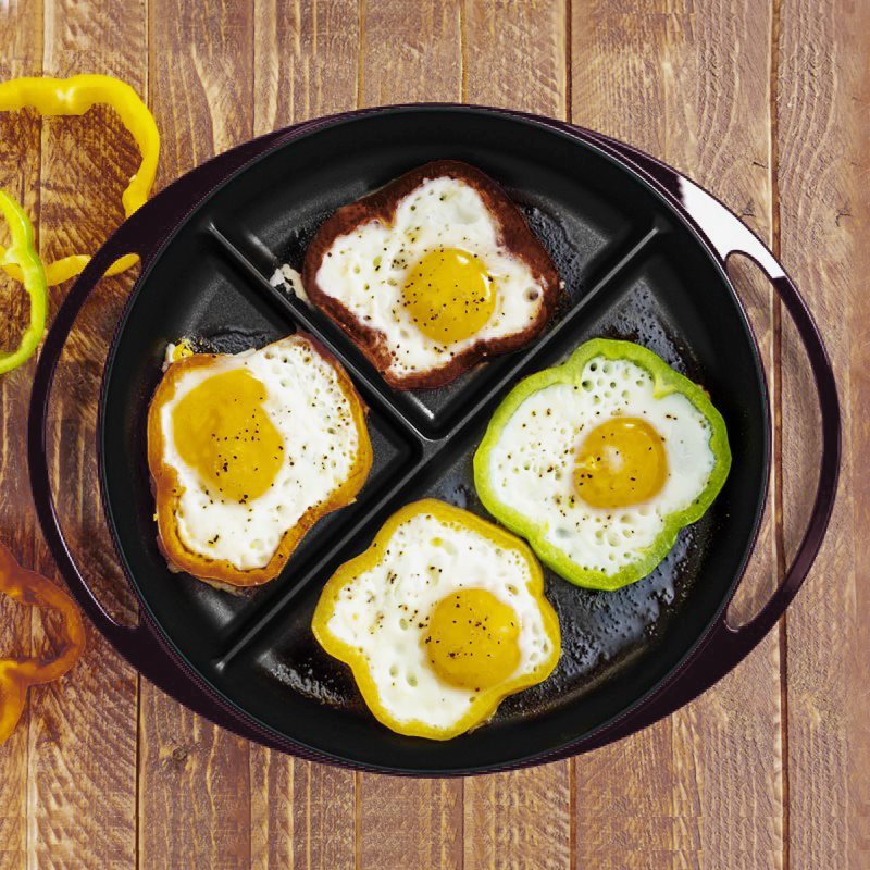 Aceasta tava din fonta este impartita in trei sectiuni cu suprafata neteda, datorita carora puteti pregati simultan pana la 4 oua.