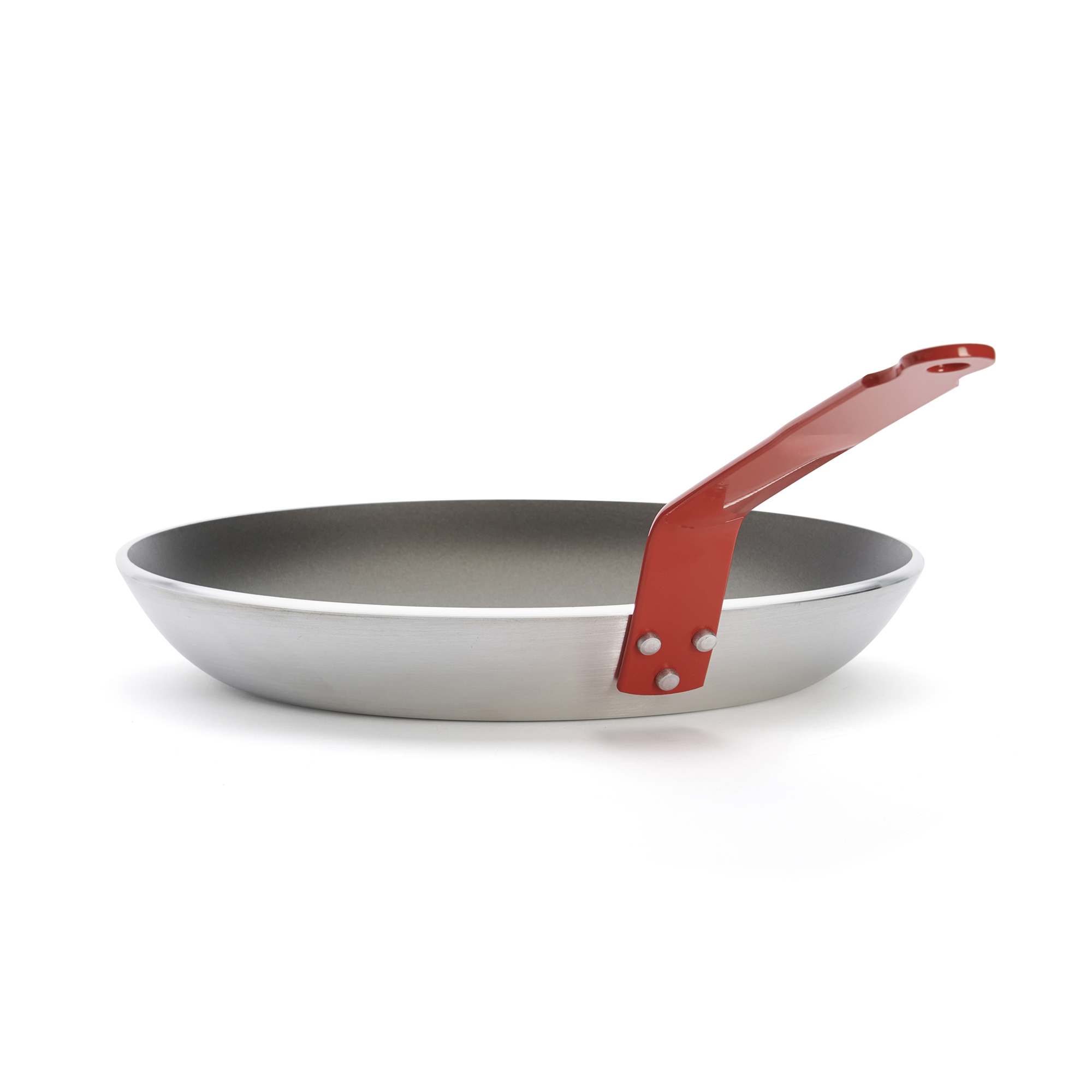 Manerul foarte rezistent al tigaii este fabricat din otel si este prins cu nituri si are culoarea rosie pentru gatirea carnii.