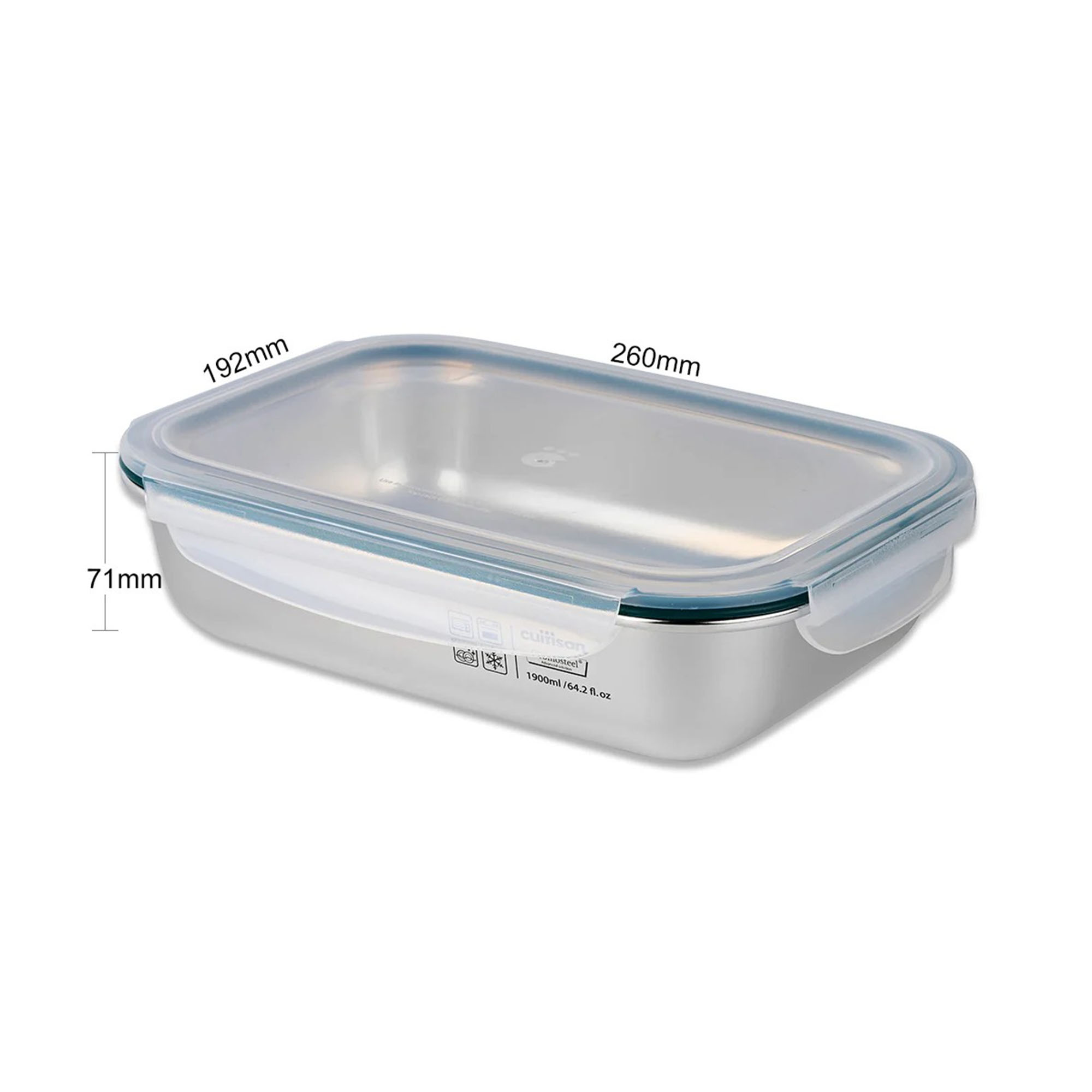 Caserola dreptunghiulara pentru pranz, marca Cuitisan, capacitate 1900 ml, dimensiuni 26 x 19,2 x 7,1 cm, fabricata din inox Cromosteel, cu capac din polipropilena si garnitura din silicon.
