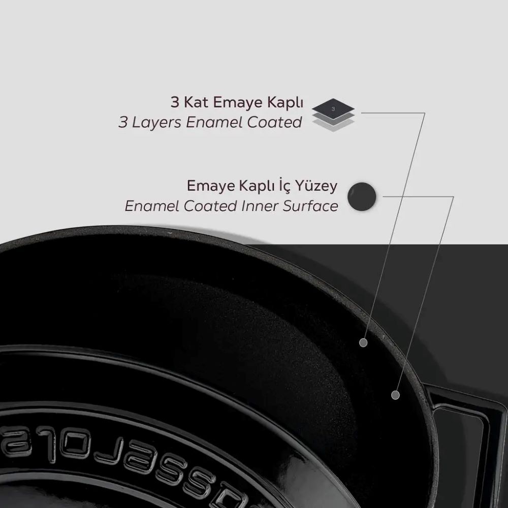 Peretii vasului au o grosime de 4 mm. In interior, vasul prezinta un strat de email negru ce faciliteaza crearea unei suprafete antiadezive atunci cand se gateste folosind grasimi.