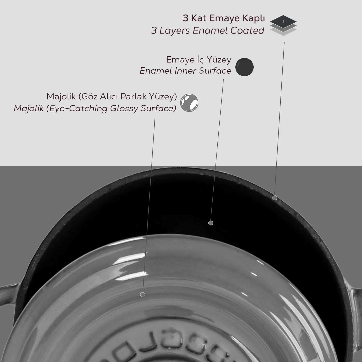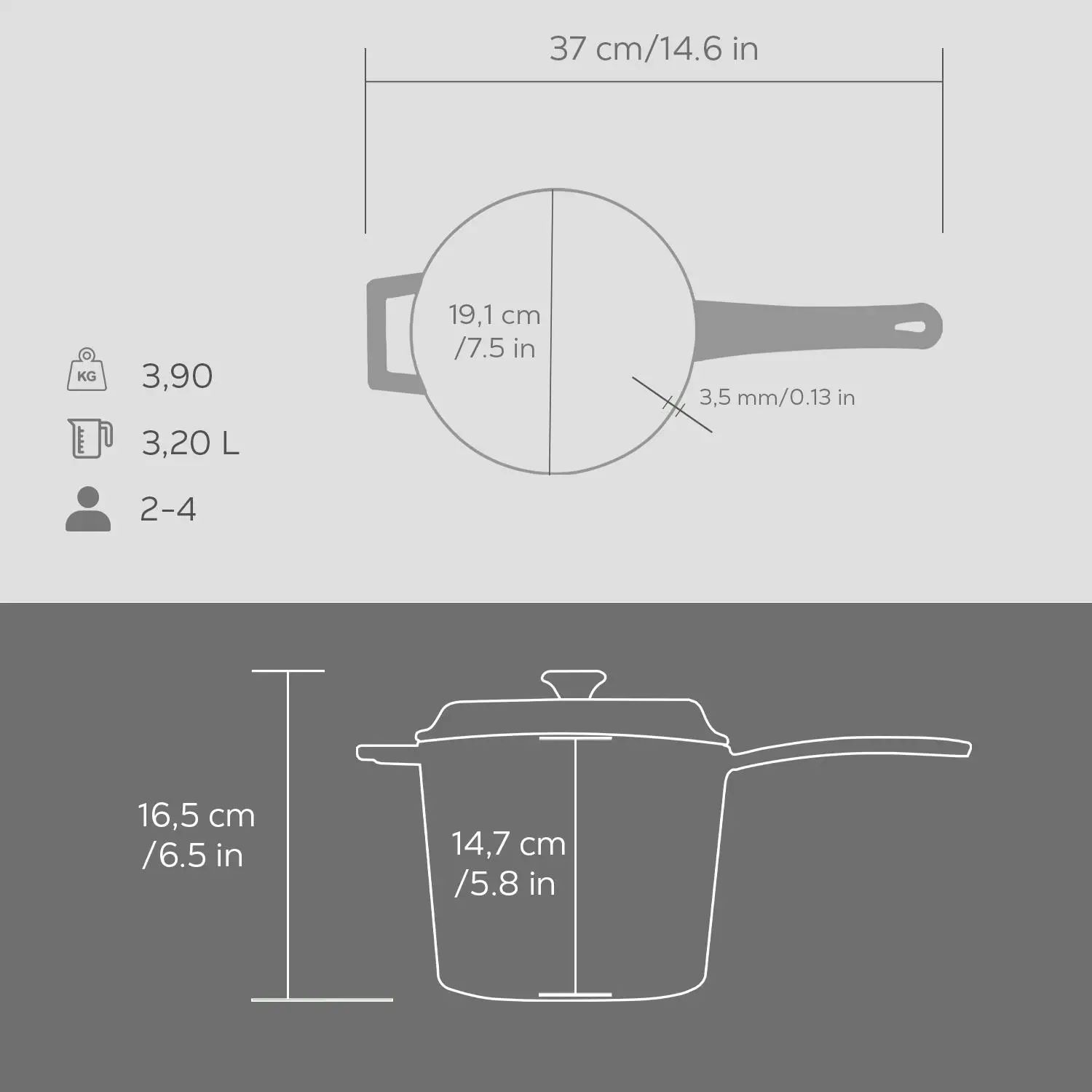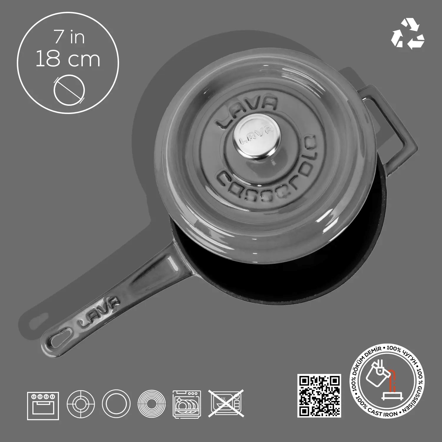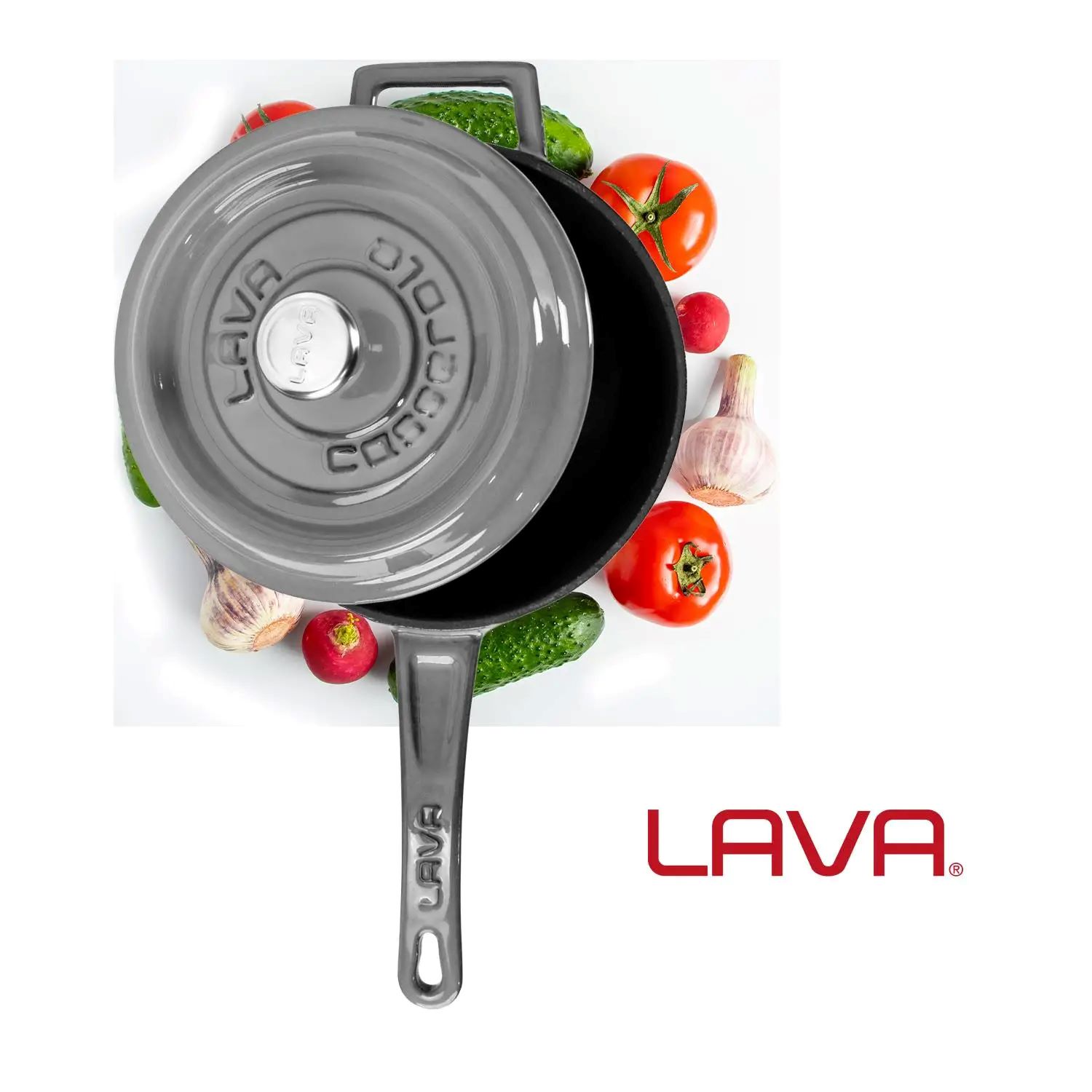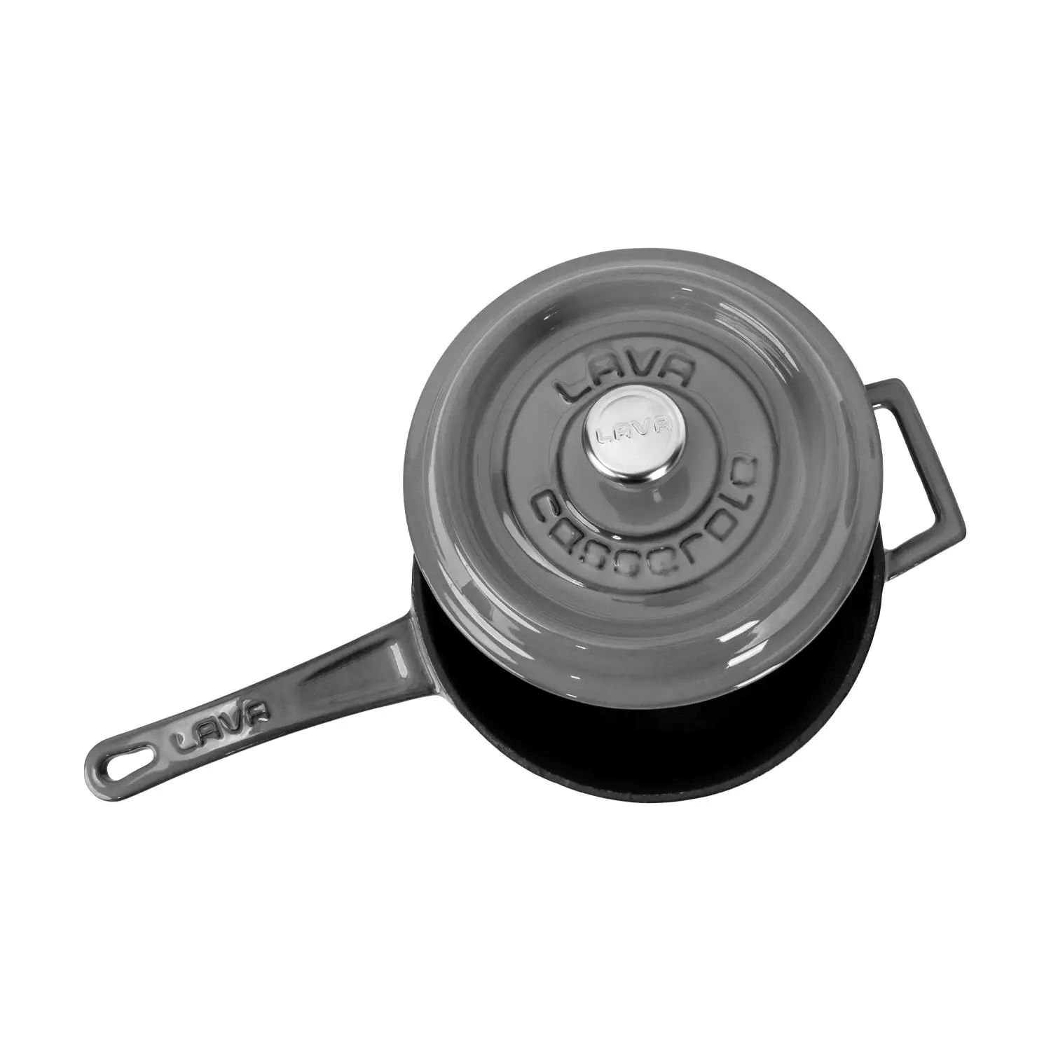 Cratita adanca pentru sos cu capac, marca Lava, din fonta emailata, diametru 18 cm, capacitate 3,2 L.