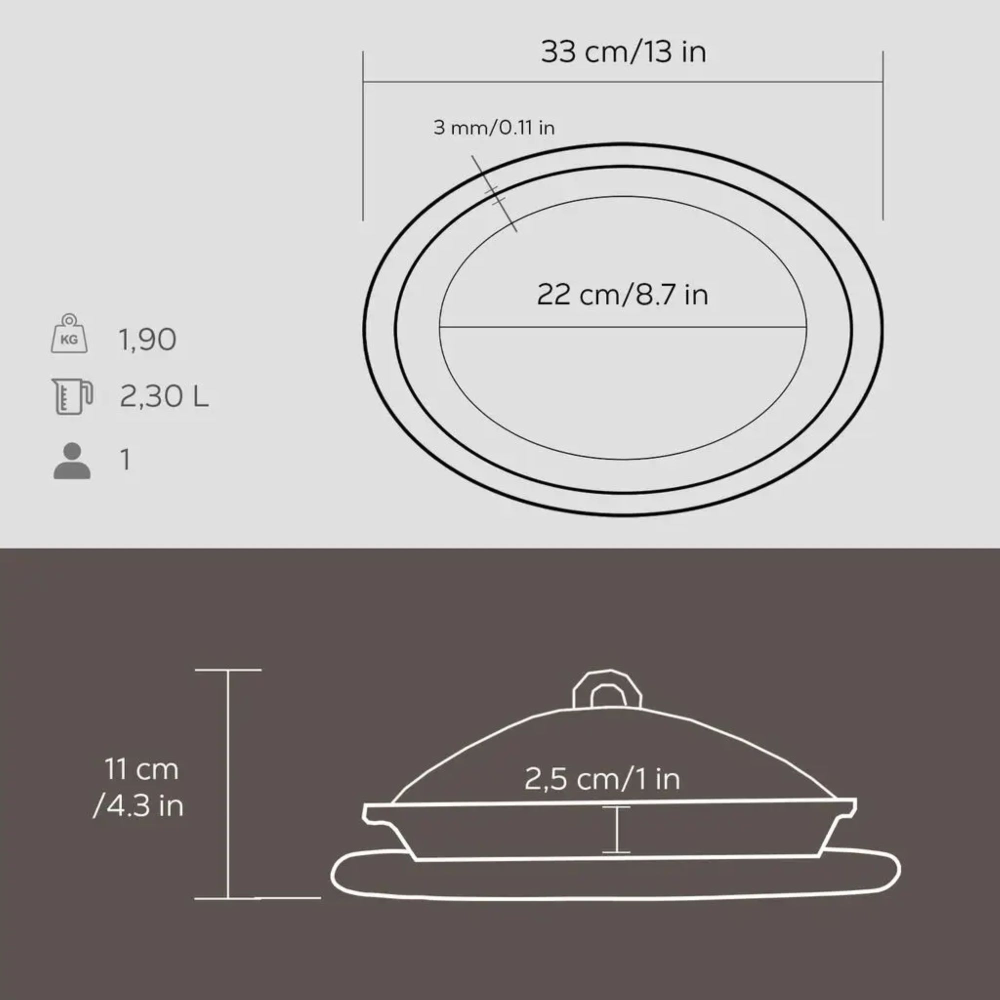 - farfurie ovala cu capac, 28 x 20 cm, din fonta, capacitate 0,45 l;