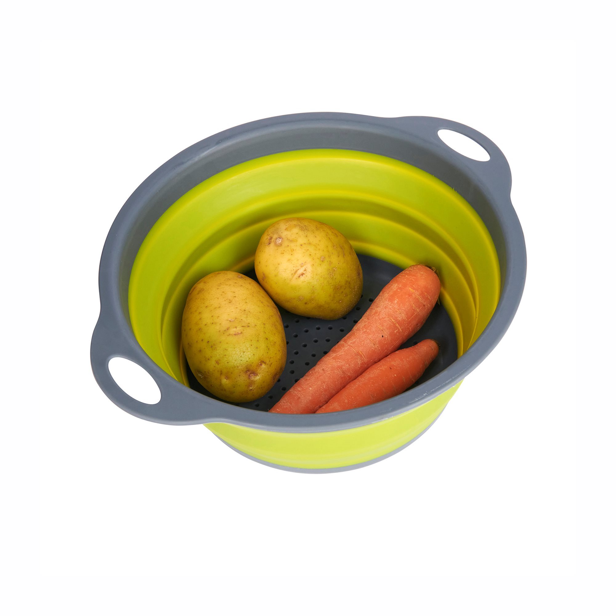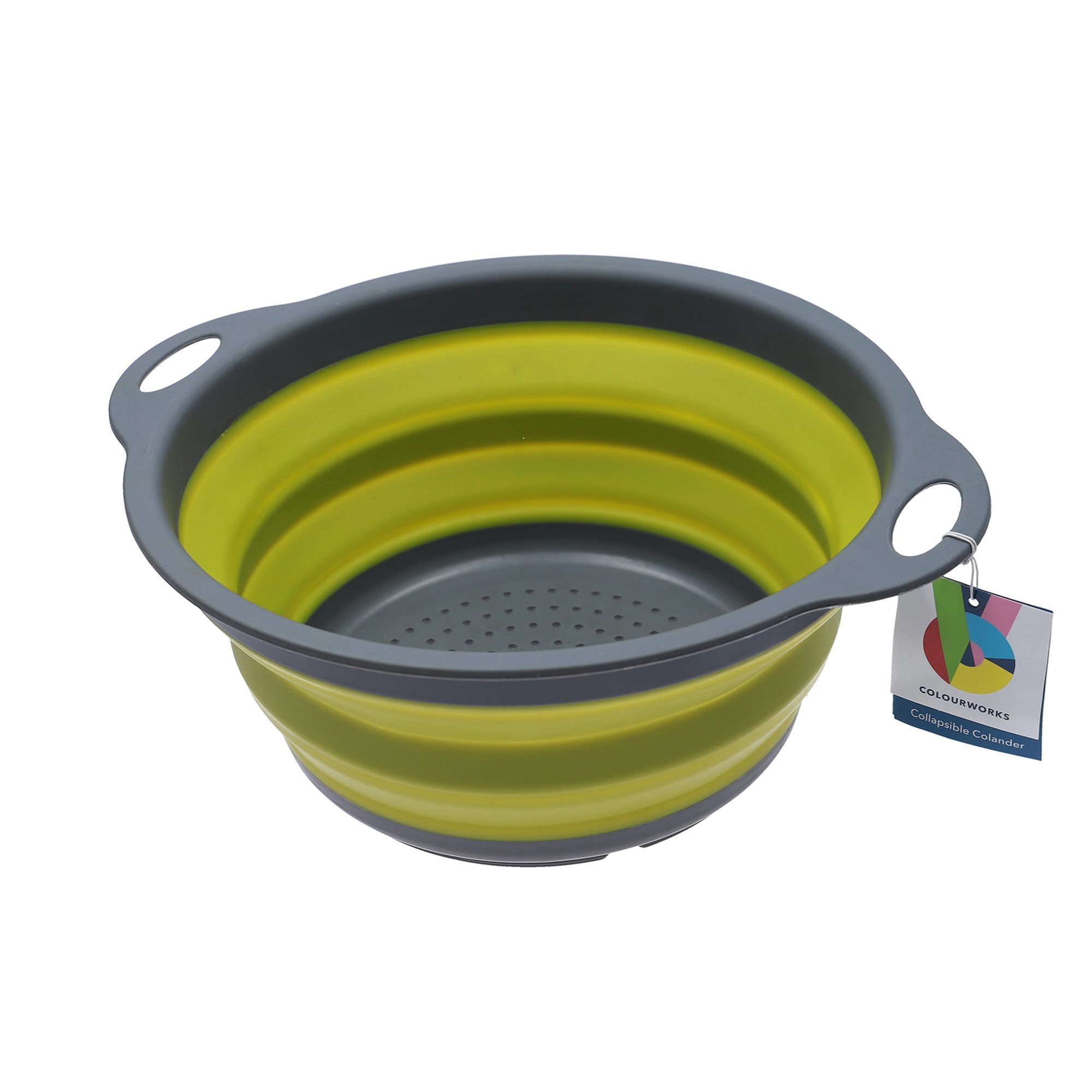 Strecuratoare pliabila, marca Colourworks, 24 cm diametru, din silicon verde termorezistent cu manere si sita de culoare gri.