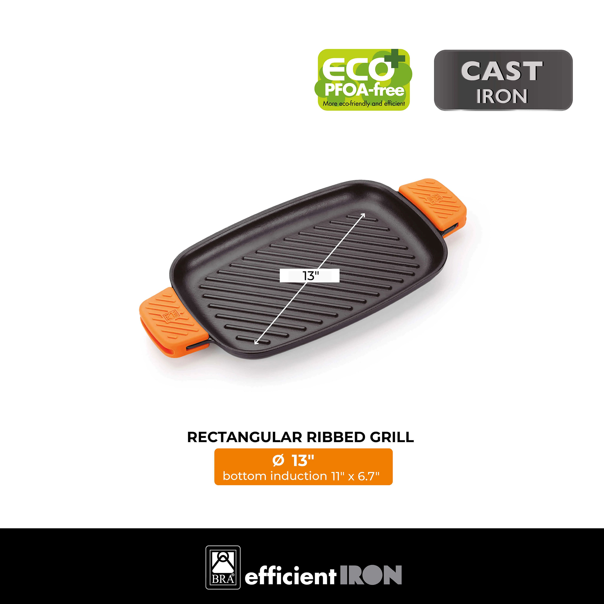 Tava grill Efficient Iron, marca BRA, cu dimensiunea suprafetei de gatit 33 x 22 cm, fabricata din fonta emailata.