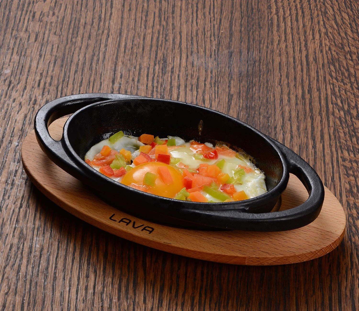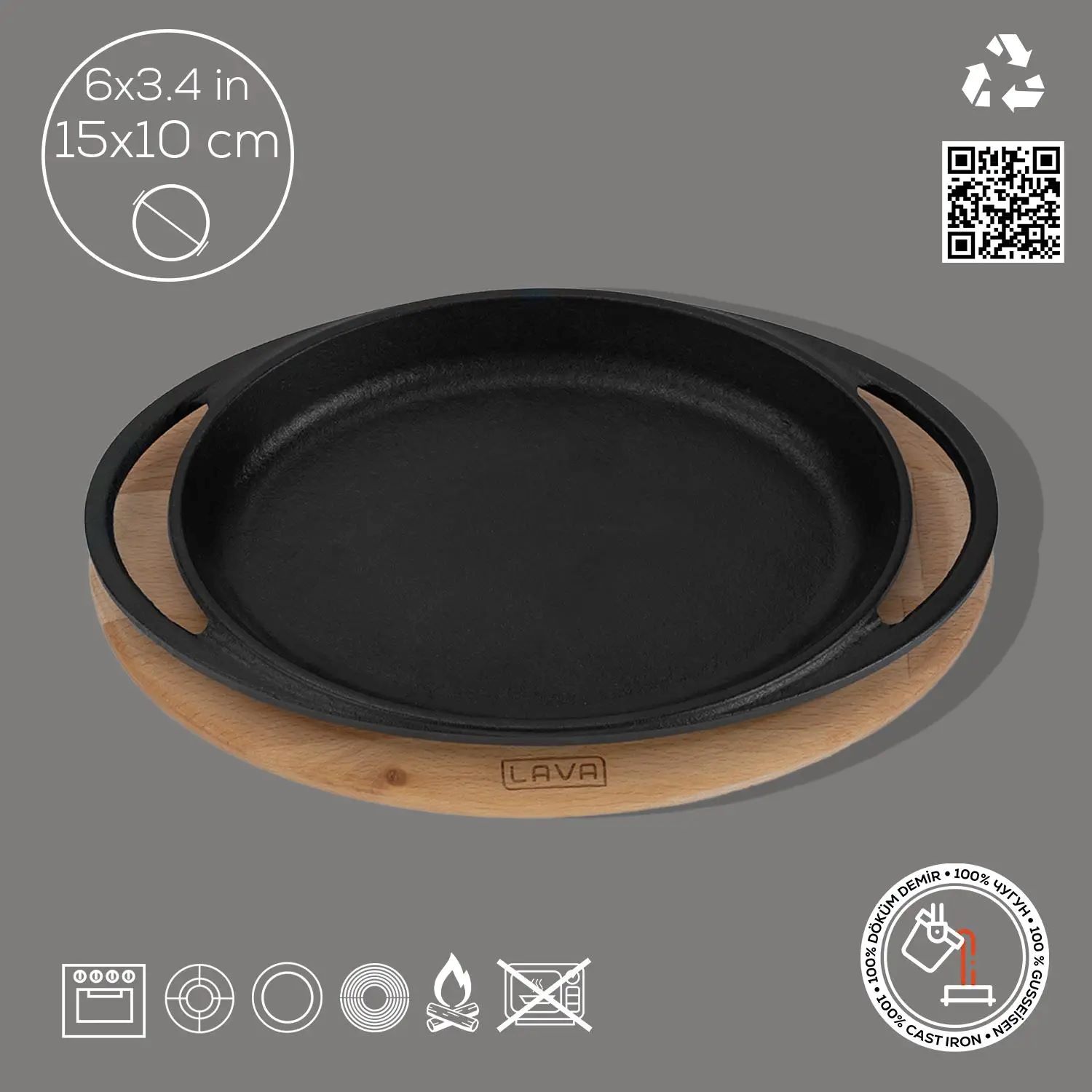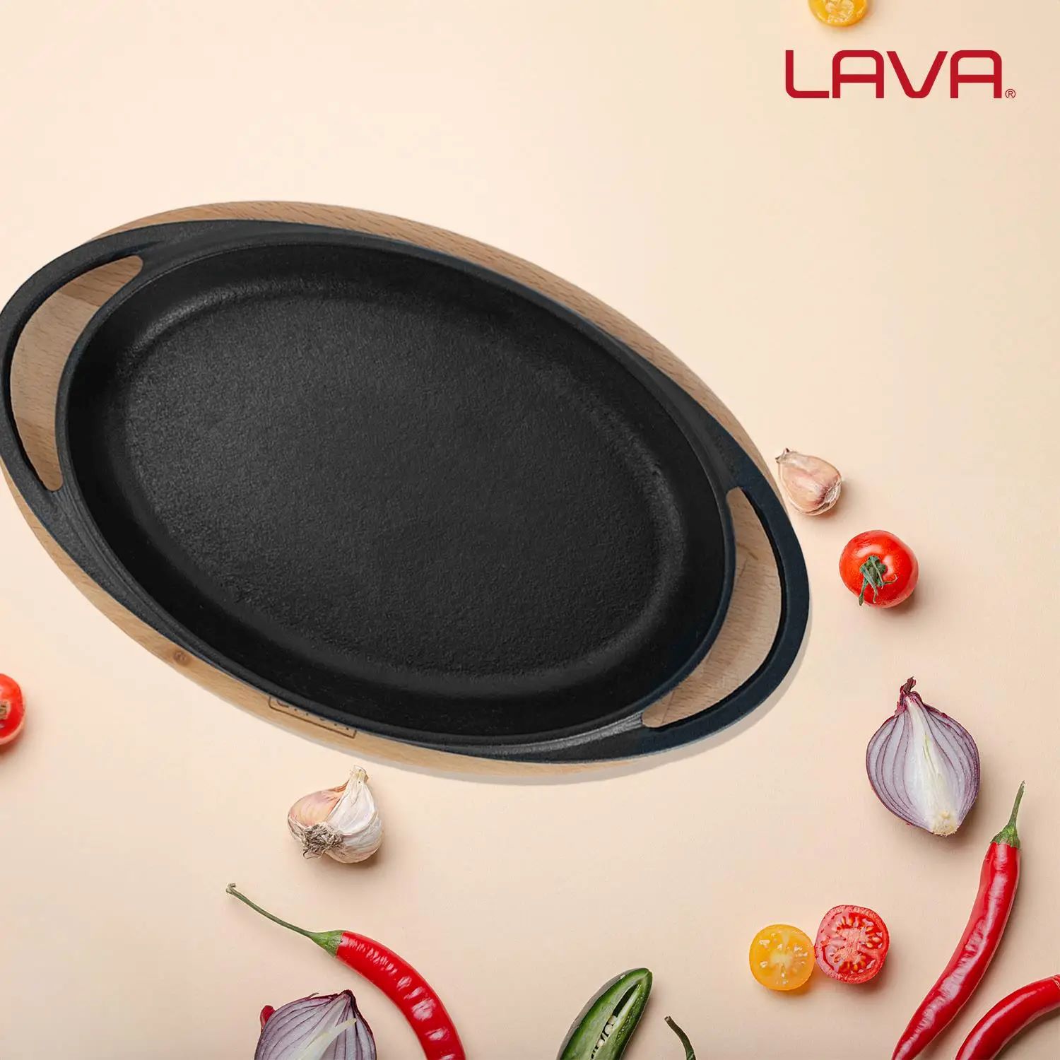 Tava ovala, marca Lava, fabricata din fonta, cu suport din lemn.