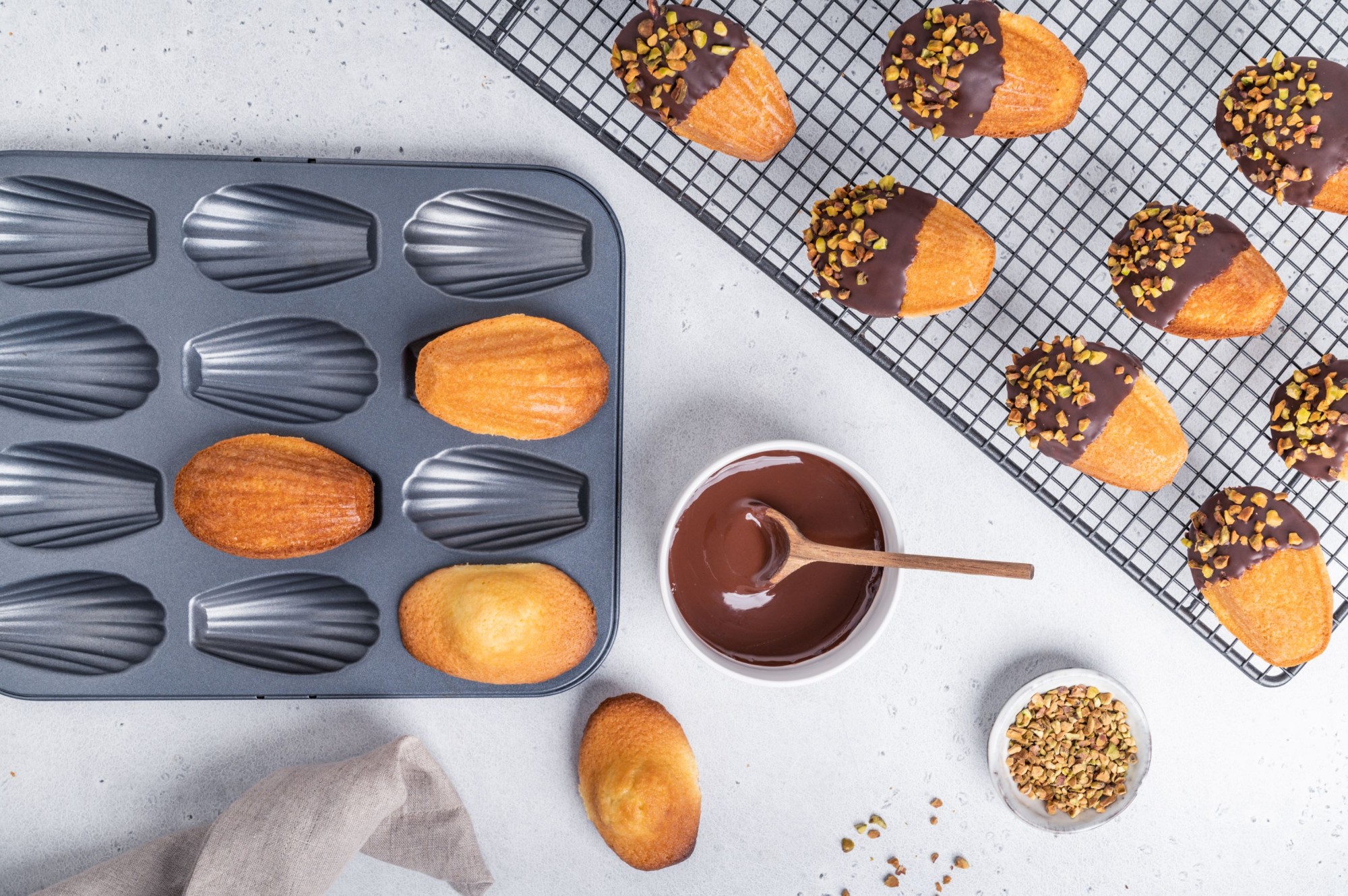 Tava pentru madlene, cu 12 compartimente, fabricata din otel, cu acoperire antiaderenta, marca de Buyer.