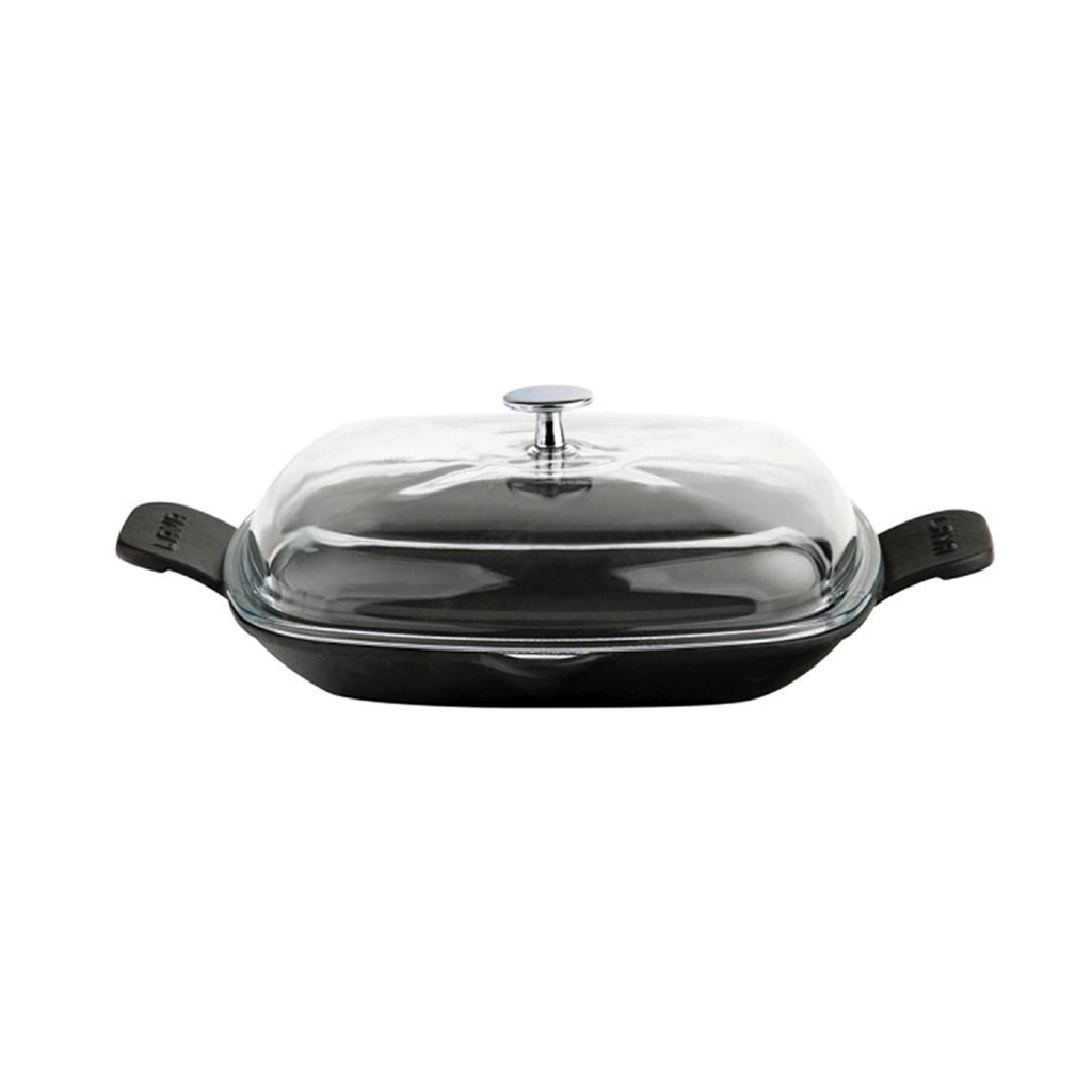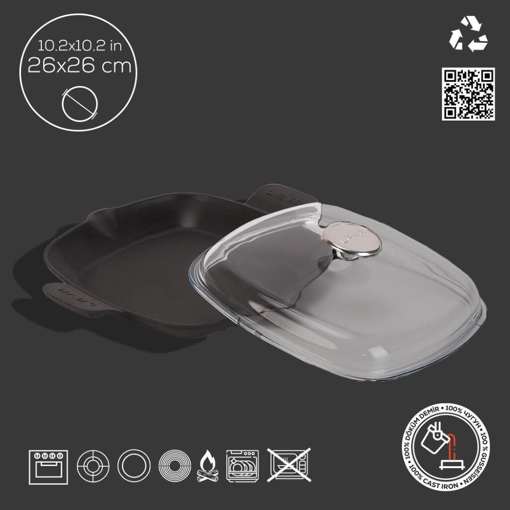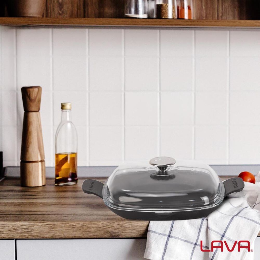 Tigaie patrata, marca Lava, dimensiuni 26 x 26 cm, fabricata din fonta. Este prevazuta cu un capac din sticla termorezistenta.