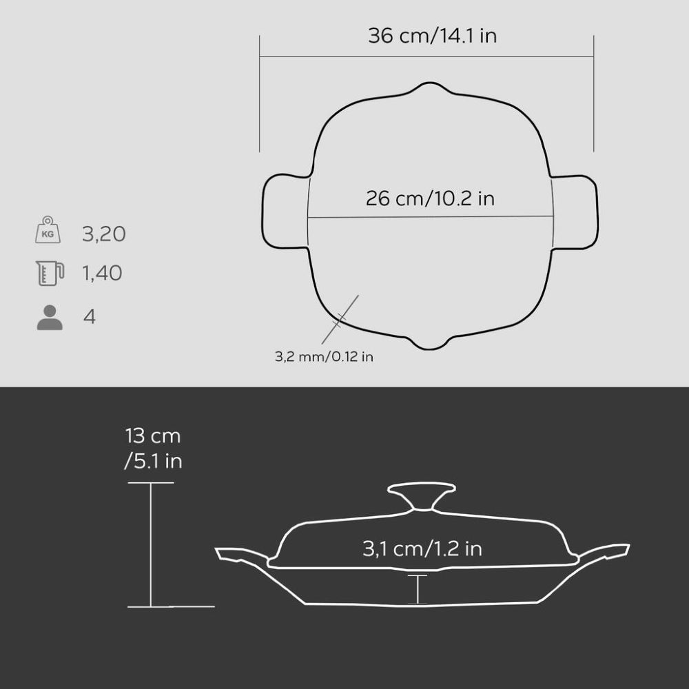 Baza vasului are 3,6 mm grosime si face posibila utilizarea vaselor Lava pe toate tipurile de plita, inclusiv la inductie. Nu se foloseste in cuptorul cu microunde.