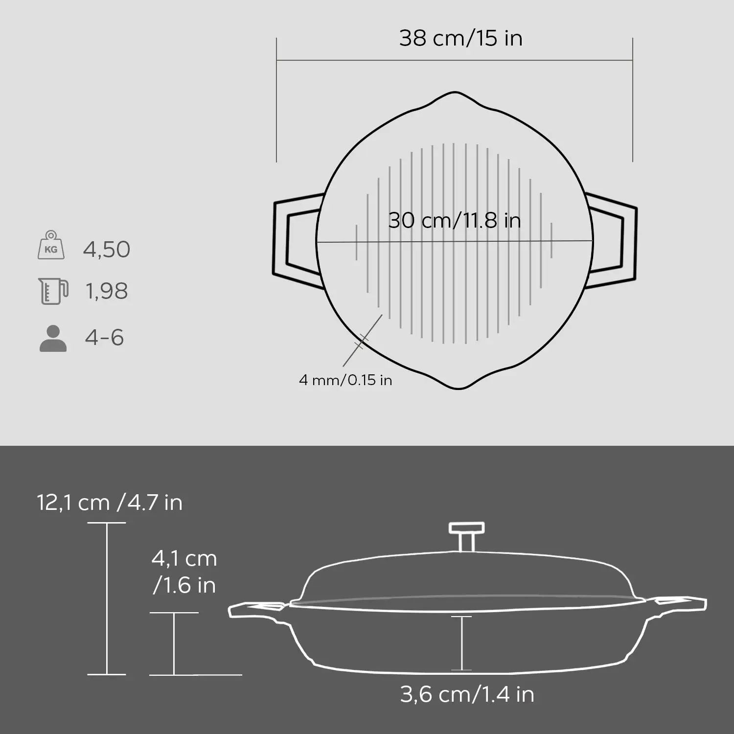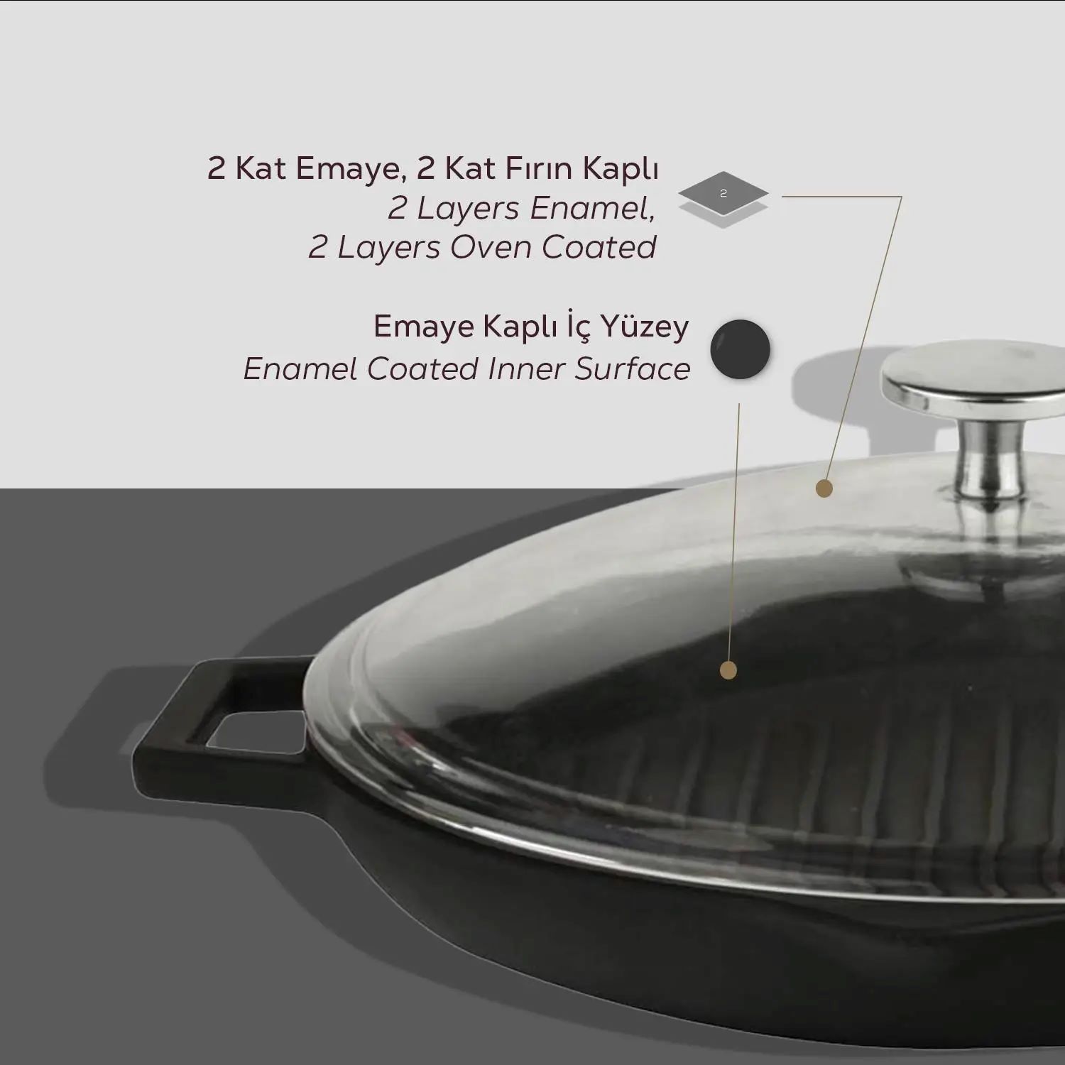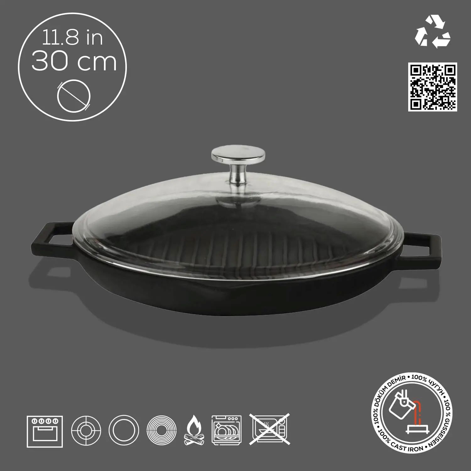 Tigaie grill, cu capac din sticla, marca Lava, diametru 30 cm, 1,98 L capacitate, fabricata din fonta.