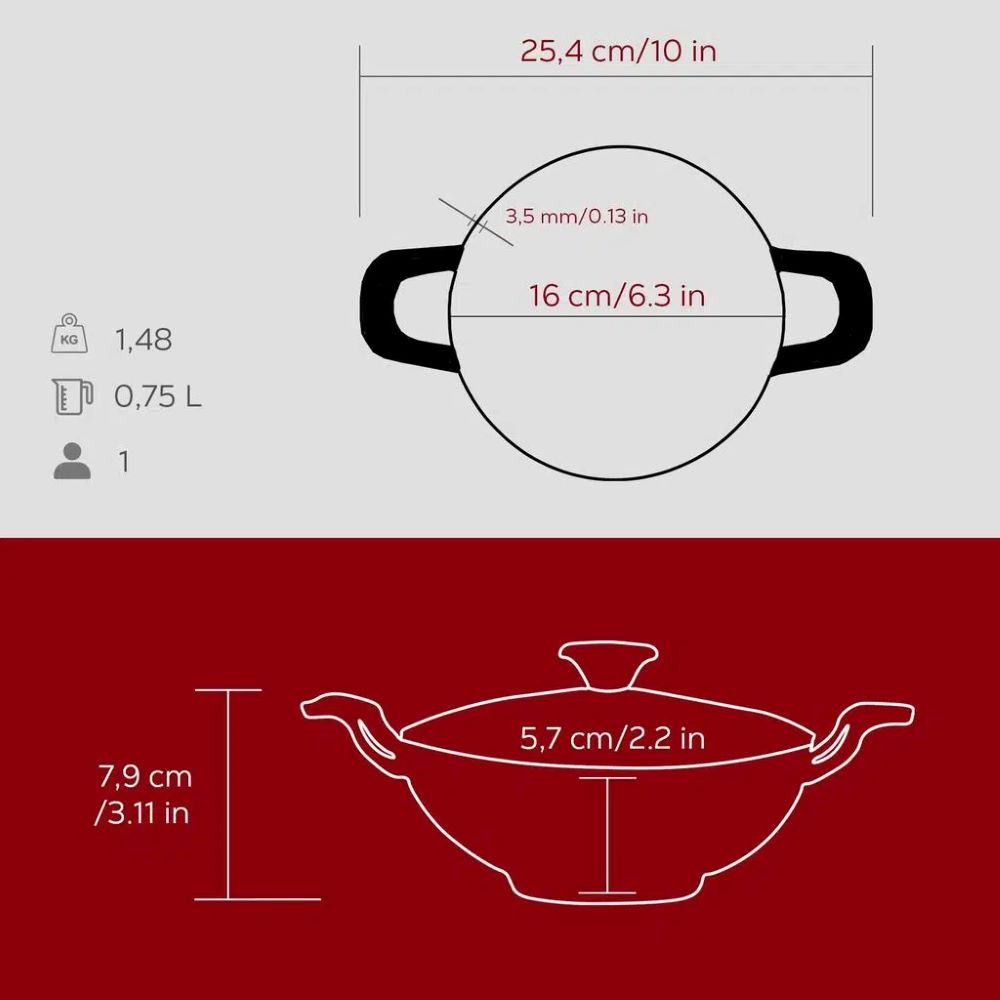 Peretii vasului au o grosime de 3,5 mm iar in interior, acesta prezinta un strat de email negru ce faciliteaza crearea unei suprafete anti-adezive atunci cand gatiti folosind grasimi.